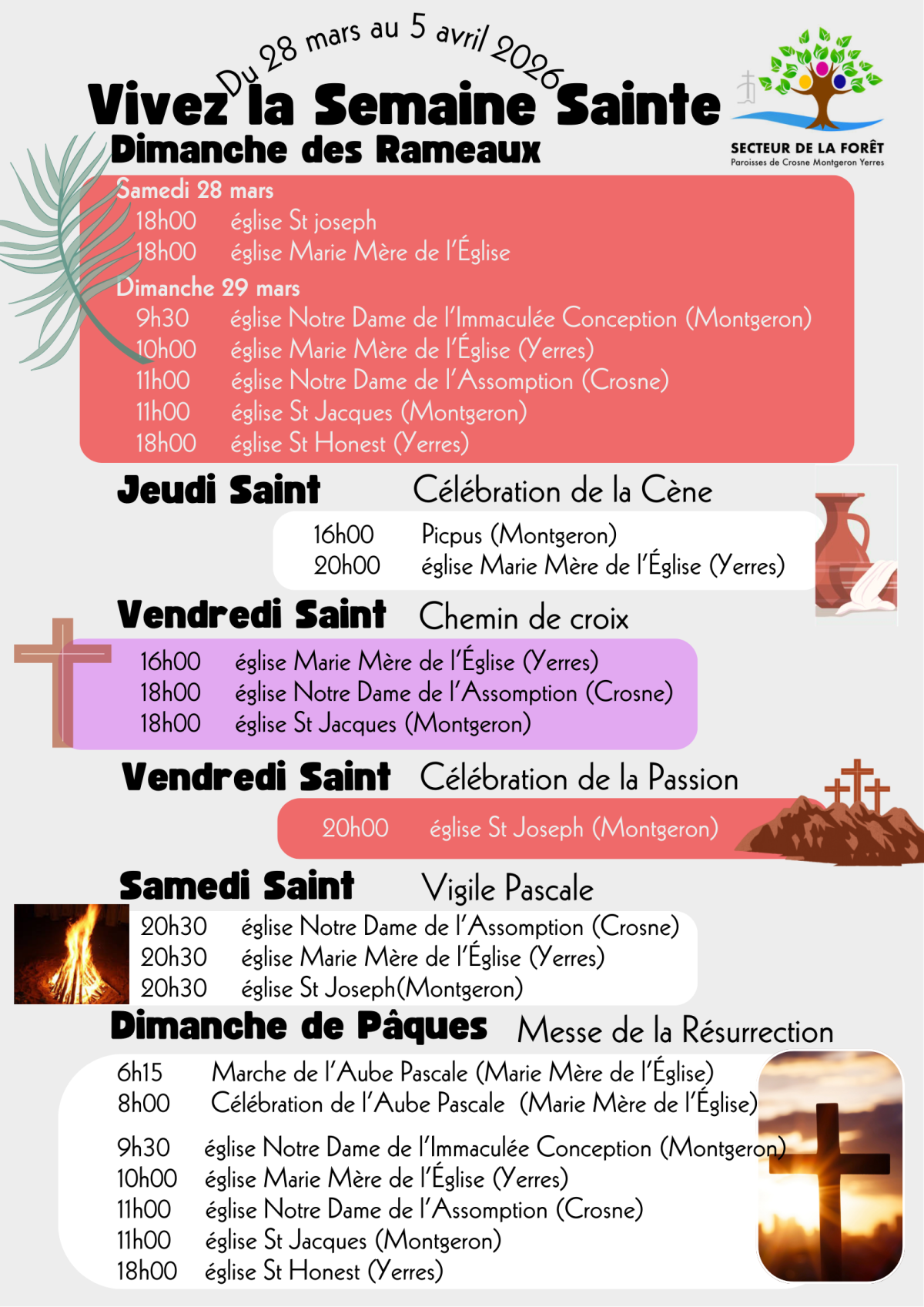 Le triduum Pascal : C'est une expression latine, c'est à dire un espace de trois jours. Le triduum Pascal va de la messe du soir du Jeudi Saint au dimanche de Pâques inclus, centre de gravité de l'année liturgique. De la Cène à la Résurrection s'écoulent ces trois jours auxquels le Seigneur a souvent fait allusion dans les évangiles et qui ensemble constituent le mystère Pascal. Lors de la dernière Cène, Jésus a offert son Corps et son Sang en nourriture à ses apôtres. La célébration du Jeudi Saint fait mémoire du lavement des pieds qui a la même signification que l'Eucharistie. Le Christ est venu pour se faire serviteur et offrir sa vie. Dans la liturgie du Vendredi Saint nous méditons le mystère de la mort du Christ et nous vénérons la Croix sur laquelle l'œuvre du salut est accomplie. Il faut dire que ce ne sont pas les souffrances qui sauvent. C'est l'Amour qui sauve. Suite à ce combat victorieux l'Église contemple le Christ au tombeau dans le repos du Samedi Saint. Elle est comme Marie la parfaite croyante qui conservera la foi et qui espère contre toute espérance en la Résurrection de Jésus.